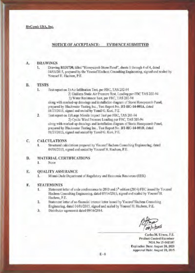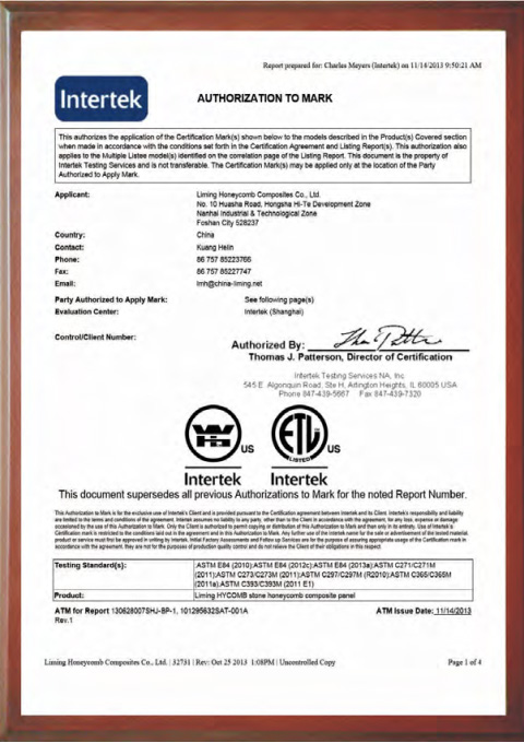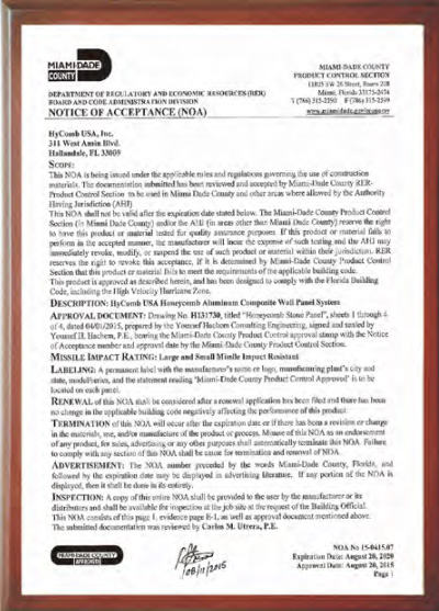 * A nossa empresa teve acesso ao relatório do ensaio de furacões NOA em Miami, EUA (Miami Dade County, Florida. NOA No. 15-0415.07) demonstra que os painéis HyCOMB e os sistemas de instalação não sairão, mesmo sob fortes pressões de vento de furacões, e manter-se-ão inalterados mesmo em experiências de simulação de impacto de alta velocidade com destroços de furacões, deste modo, podemos garantir-lhe uma grande segurança e resistência dos nossos produtos a situações diversas